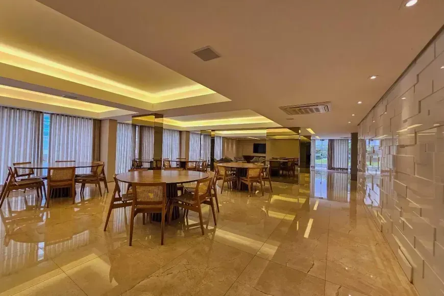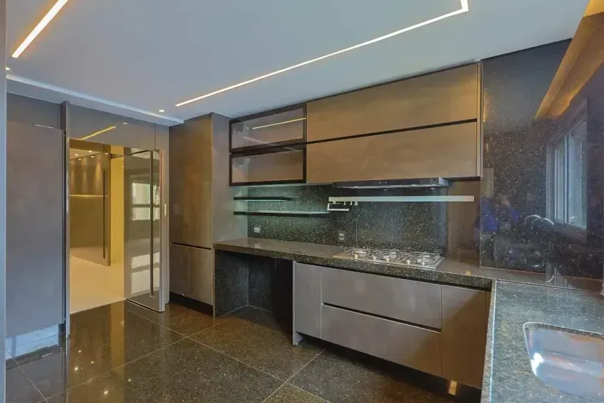 Este lindo projeto proporciona aos moradores bem-estar e conforto visual absoluto em espaço interno de 260 m² distribuídos em ampla sala para 4 ambientes com imponente piso em Mármore e que ressalta os detalhes e o projeto de iluminação de cada um dos ambientes. A varanda com pé direito duplo para integrada à sala e deu lugar ao espaço gourmet onde os convidados ainda se beneficiarão com o panorama das montanhas de Nova Lima. Vale destacar cada um dos elementos utilizados no projeto e a harmonia entre eles, tal qual a bancada do espaço gourmet e os detalhes do revestimento em Travertino Silver. A espaçosa e convidativa cozinha conta com sala de almoço, própria para as refeições do dia-a-dia, recebeu marcenaria impecável e já conta com ‘cook-top’ e coifa devidamente instalados. Área de serviço e DCE anexos completam o seu espaço social.