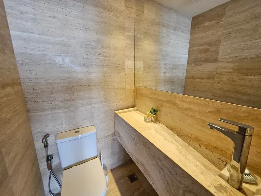 Sala para 03 ambientes, com piso em travertino, sonorização e projeto de iluminação, lavabo.