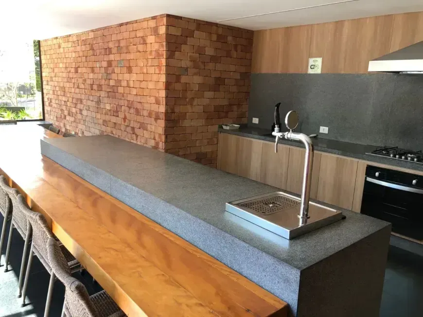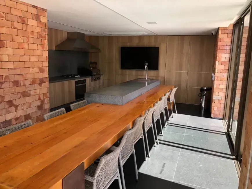 Cozinha com painel retrátil para integrar os ambientes. Área de serviço quarto e banheiro de funcionária.