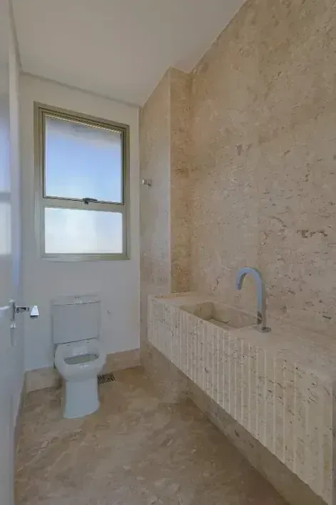 No 1º nível, um amplo living com pé-direito duplo, piso em mármore Bege Bahia escovado e excelente iluminação natural. São quatro suítes confortáveis, incluindo a máster, além de lavabo, cozinha planejada, área de serviço, hall privativo e DCE.