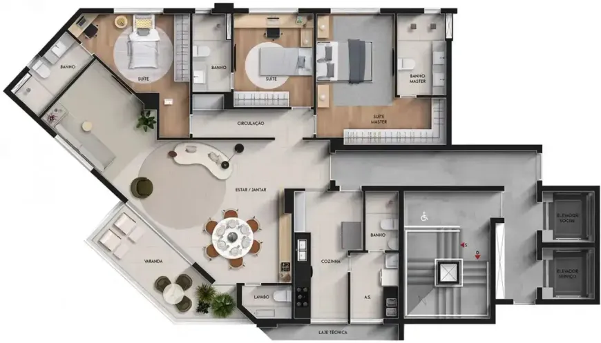 Apartamentos de 04 Quartos, sendo 02 suíte e 02 semi-suites, lavabo, sala para 02 ambientes, varanda, cozinha, banheiros, acabamentos frios com porcelanato, granito.